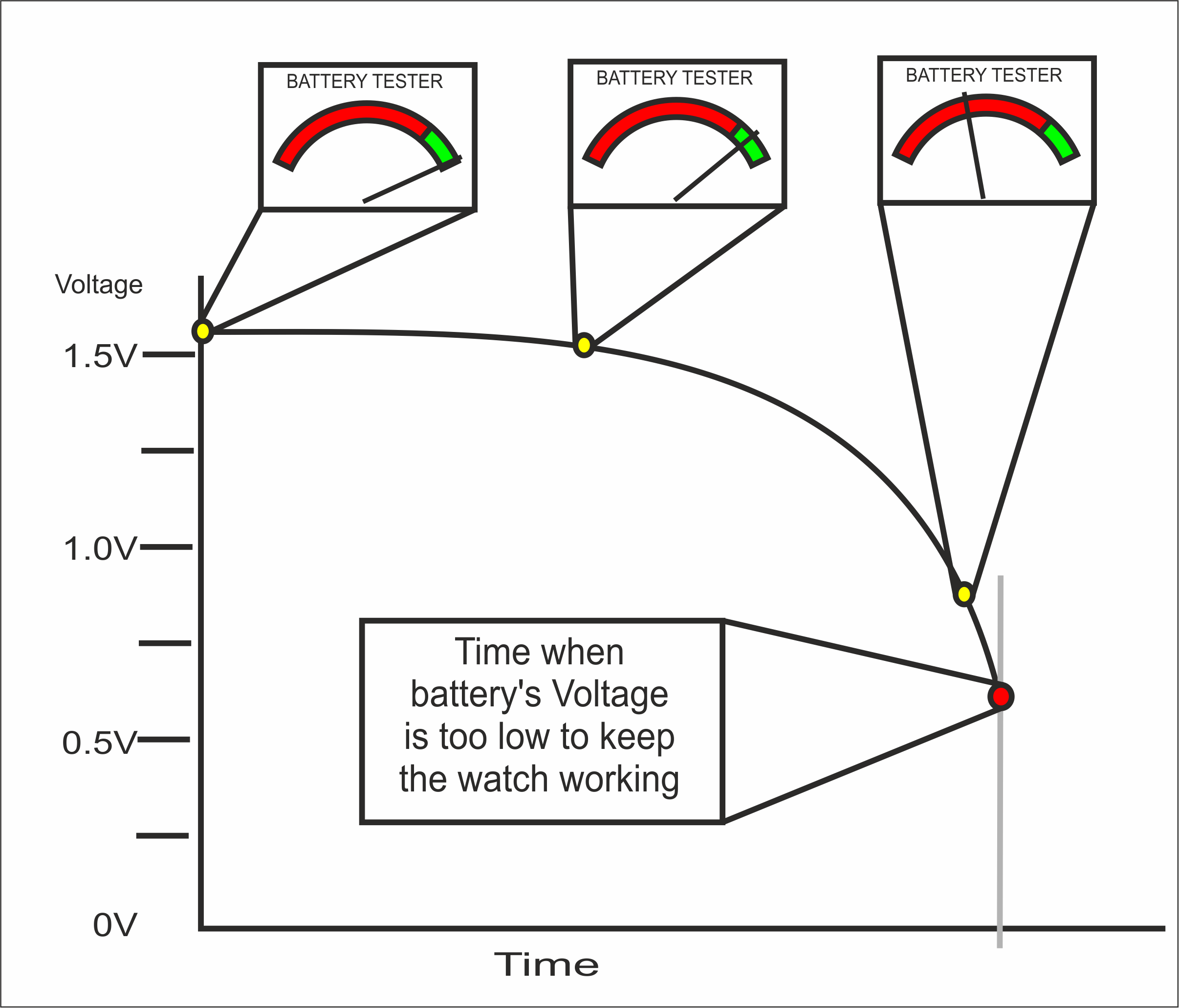 Внизу приведен график, показывающий напряжение батарейки часов в зависимости от времени и точки остановки хода часов. Тестеры батареек измеряют напряжение, которое имеет батарейка или аккумулятор (не сколько электричества или сколько времени осталось у срока службы батарейки). Напряжение не падает со временем, как неискушенному пользователю может показаться. Тестер измеряет 1,5 В большую часть срока службы часовой батарейки, но напряжение падает быстрее и ближе к концу срока службы. По этой причине часовые мастера Mystery Time обычно меняют батарейки и советуют клиенту заряжать их до предела.