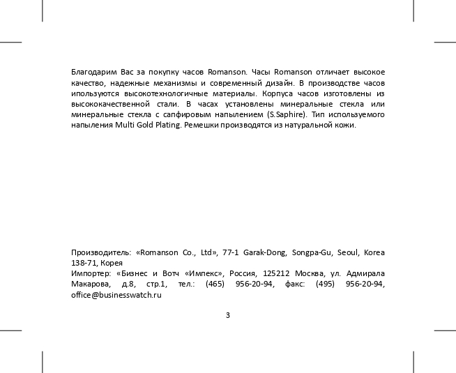 На все часы Romanson, которые Вы приобретаете в салонах или интернет магазине Mystery Time, действует 2-х летняя международная гарантия производителя. В случае возникновения гарантийного случая, Вам необходимо обратиться по адресу, указанному в гарантийном талоне. Обращение в любой другой сервисный центр аннулирует Вашу официальную гарантию.